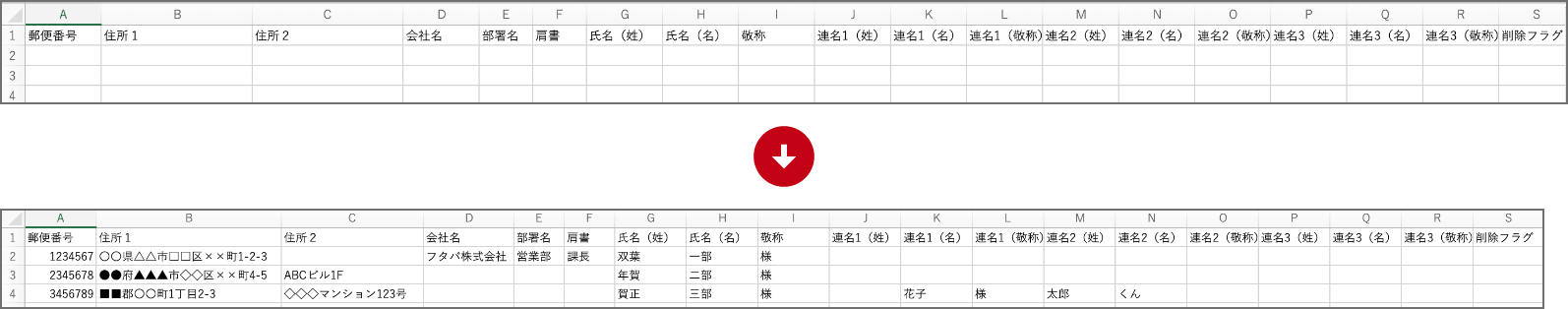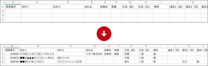 • 2ダウンロードしたファイルに宛名情報を入力し宛名ファイルを作成・保存します